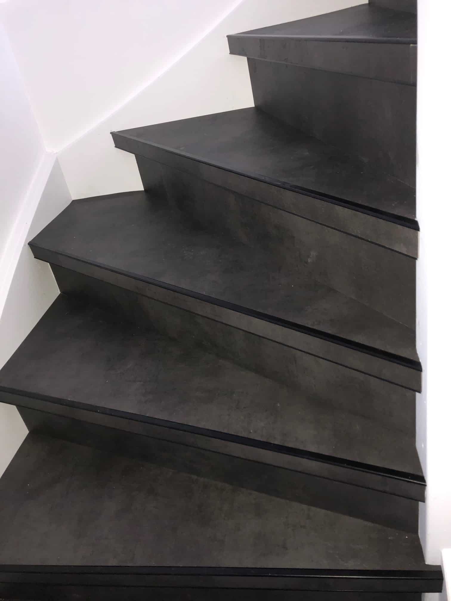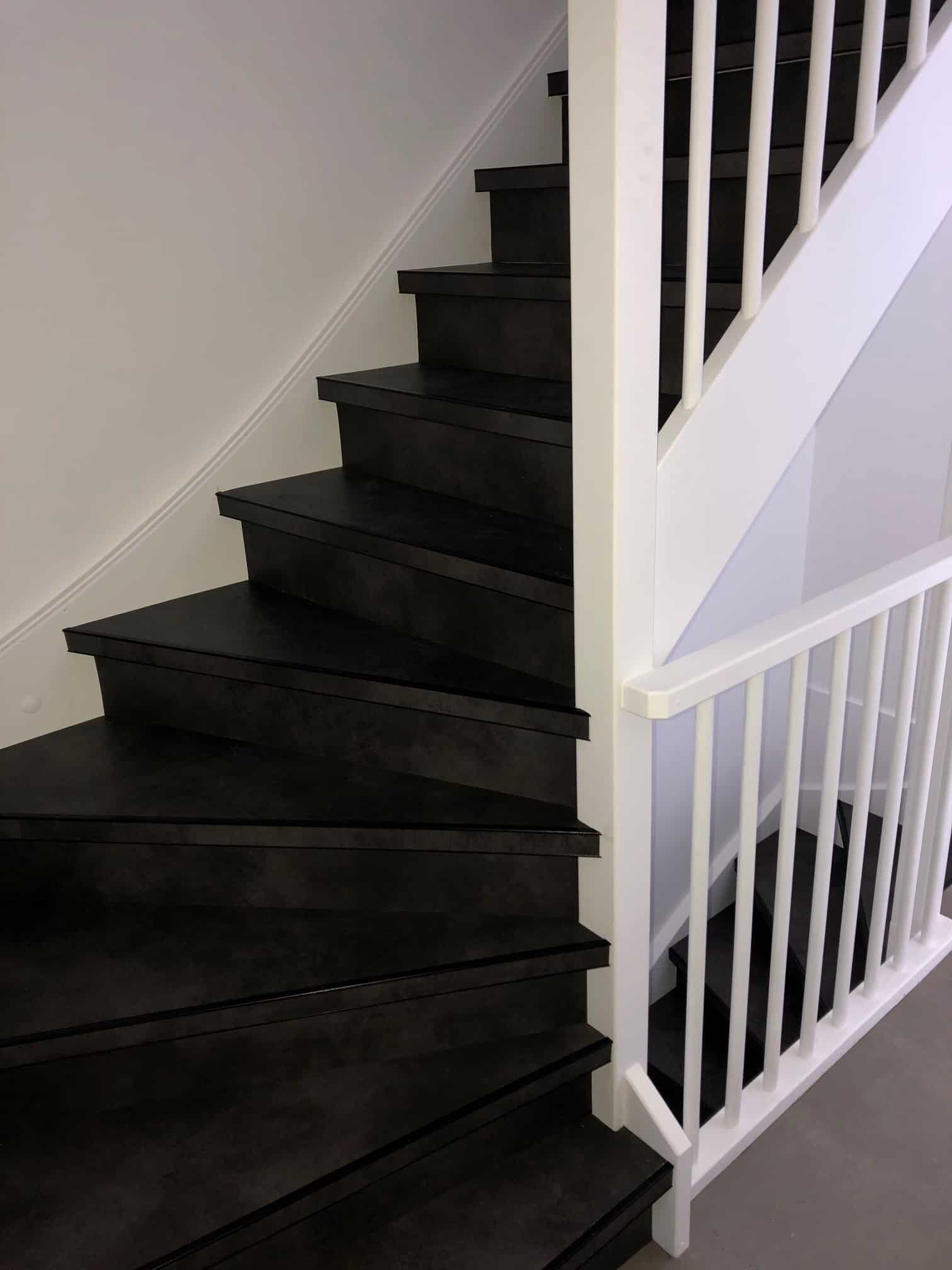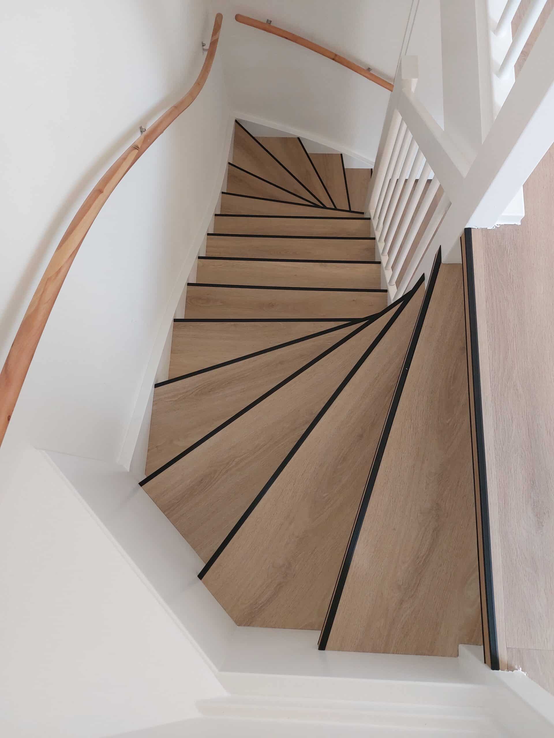 Traprenovatie kan door middel van pvc overzettreden of verlijmd pvc stroken met pvc-trapneusprofielen is een perfecte oplossing voor uw versleten trap.